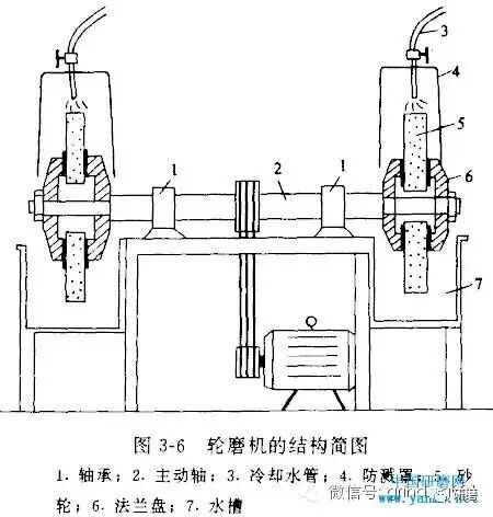 輪磨機都帶有防濺罩和水槽。防濺罩一般比較堅固。圍住砂輪的后部和上部(除工作面外),目的有2個:①防冷卻液飛濺;②防止砂輪萬一破裂飛出傷人。水槽在砂輪下部,用于盛從砂輪上飛濺出的冷卻液,其底有排水孔,可隨時排除冷卻液及磨屑,輪磨機的冷卻給水裝置多安槳在防濺罩頂部,直接穿過防濺罩向砂輪噴淋冷卻液,冷卻征用量可用水龍頭控制、也有的輪磨機采用吸水性好的毛巾一端格在砂輪上,一端固定于防濺罩上,同樣可以起冷卻砂輪作用。