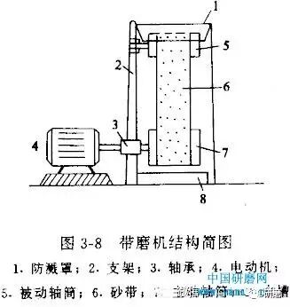 帶磨機主要部件有2個鈾筒(多用橡皮制成):①主動軸簡,與電動機連接;②被動軸筒。環(huán)狀砂帶套在兩個軸簡上,主動軸簡轉(zhuǎn)動時,靠砂帶帶動被動軸簡一起轉(zhuǎn)動。其他部件還有軸承、防濺罩、水槽等,這些部件的作用與輪磨機的類似。