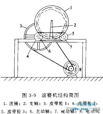 ?。?)滾磨機 液磨機主要作用是磨削除去寶石毛坯的棱角,使之變圓滑。其主要部件有滾筒、動軸和軸承、被動軸等。其結(jié)構(gòu)如圖3-9所示。滾桶放在主動軸和被動袖上,它靠主動軸的驅(qū)動來轉(zhuǎn)動。而主動軸一端用直徑較大的皮帶輪1與電動機連接,另一端的皮帶輪2與被動輪一瑞的皮帶輪3通過皮帶相連。被動軸直徑與主動軸直徑相同,其轉(zhuǎn)速和線速度也與主動軸的相同。它利主動抽一起驅(qū)動滾桶轉(zhuǎn)動。